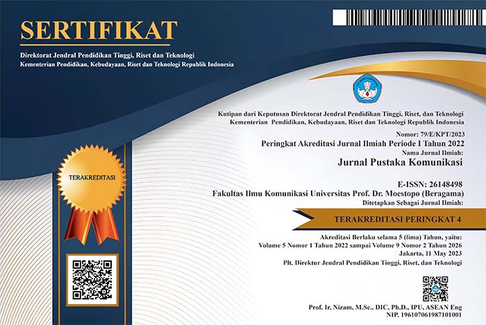 Jurnal Pustaka Komunikasi accredited fourth rank (SINTA 4) based on the Decree of the Director General of Higher Education, Research and Technology No. 79/E/KPT/2023 from Volume 5 No. 1 of 2022 until Volume 9 No. 2 of 2026.