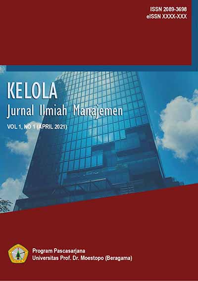 KELOLA: Jurnal Ilmiah Manajemen, with ISSN 2089-3698 (printed) and ISSN 2776-9941 (Online), is published by Magister of Management Postgraduate Program, University of Prof. Dr. Moestopo (Beragama). KELOLA Journal is published twice a year (every June and December). In each edition, KELOLA Journal receives articles that will be reviewed by either internal or external editors. Subsequently, the article will be reviewed by our reviewer with related expertise. The article will be reviewed by blind peer review. KELOLA Journal started using Online Journal System (OJS) in June 2021.