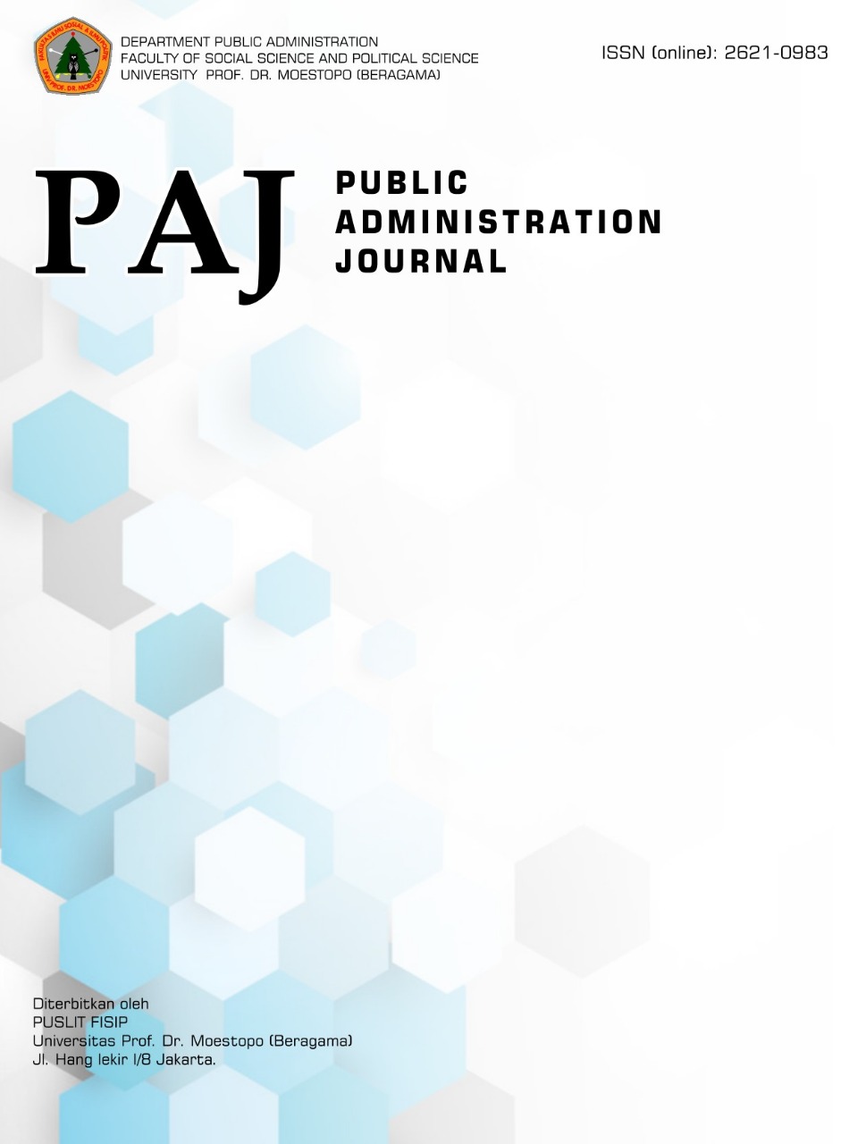 Public Administration Jurnal (PAJ) adalah publikasi tulisan Ilmiah hasil penelitian bagi Program Studi Administrasi Publik Fisip Universitas Prof. Dr. Moestopo (Beragama) yg mengembangkan Ilmu-ilmu sosial dengan memiliki tiga elemen kajian legislatif, yudikatif dan eksekutif.